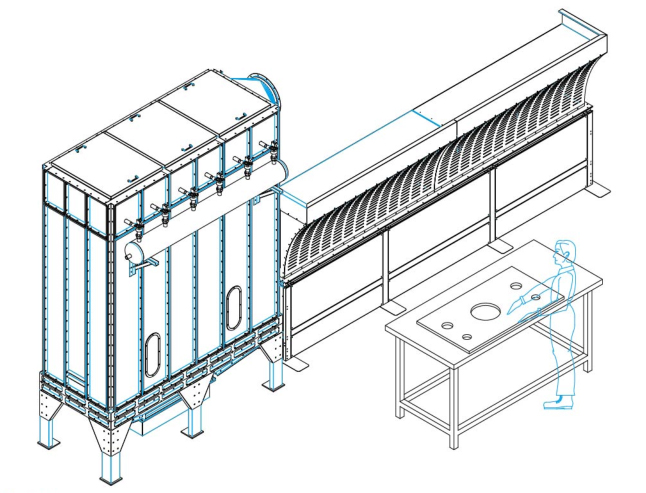 The dust centralized collection system breaks the traditional single dust box form, and the dust generated in the grinding, cutting, milling and other production processes is uniformly collected into the outdoor equipment through the dust collecting hood, and is adsorbed by the high-density fiber filter. Spraying and other devices for filtration, cleaning, collection, and purification of emissions. The internal air quality of the plant is optimized.